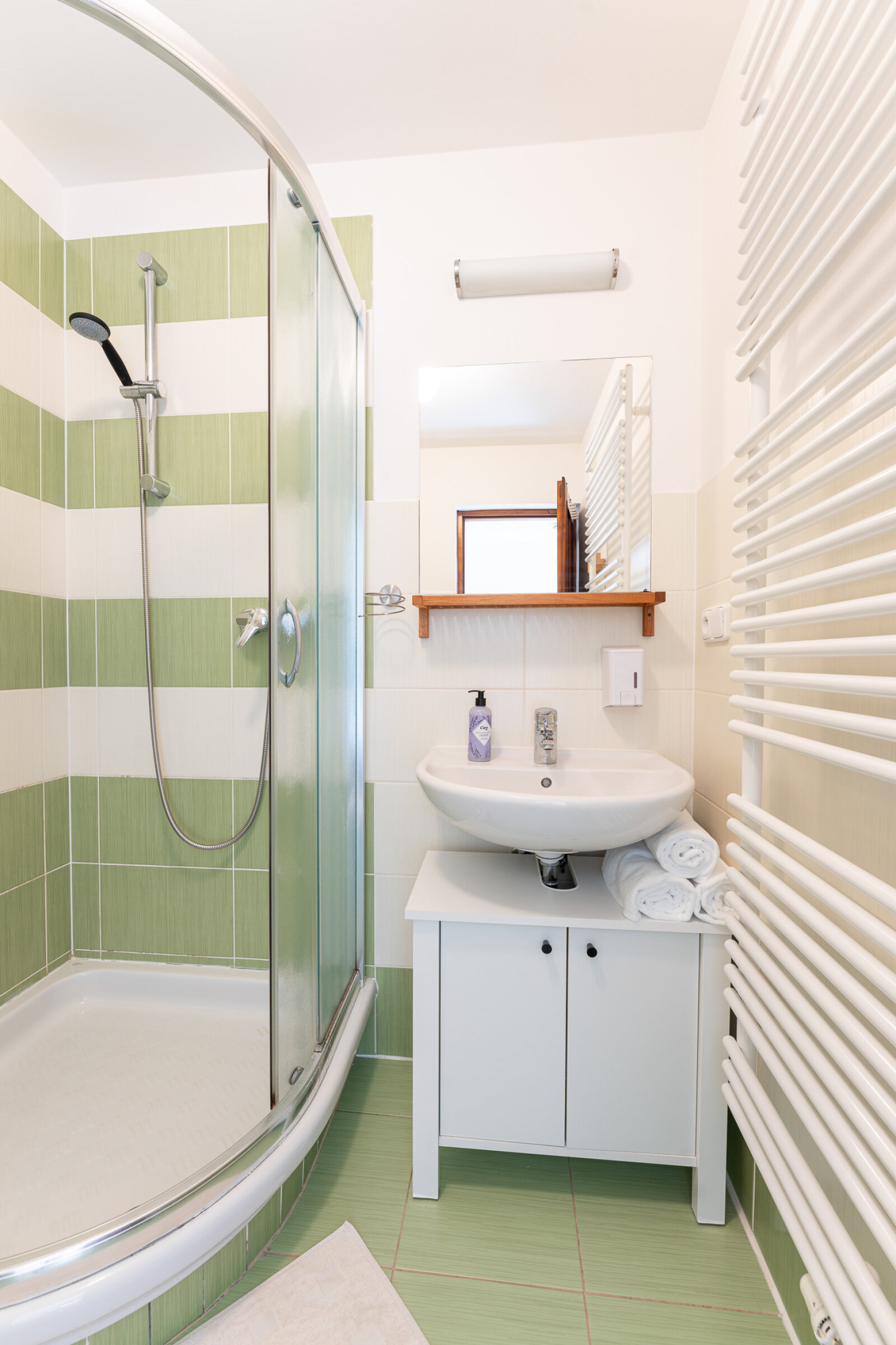 Apartmány nabízí vlastní sociální zařízení se sprchovým koutem, umyvadlem a WC