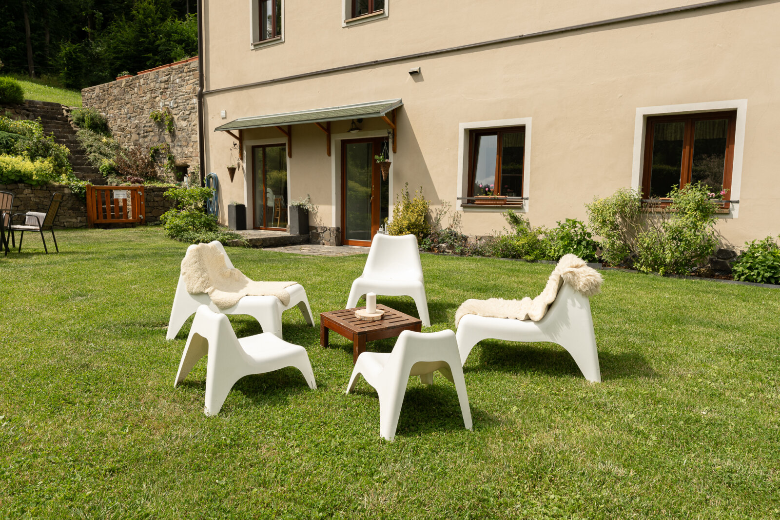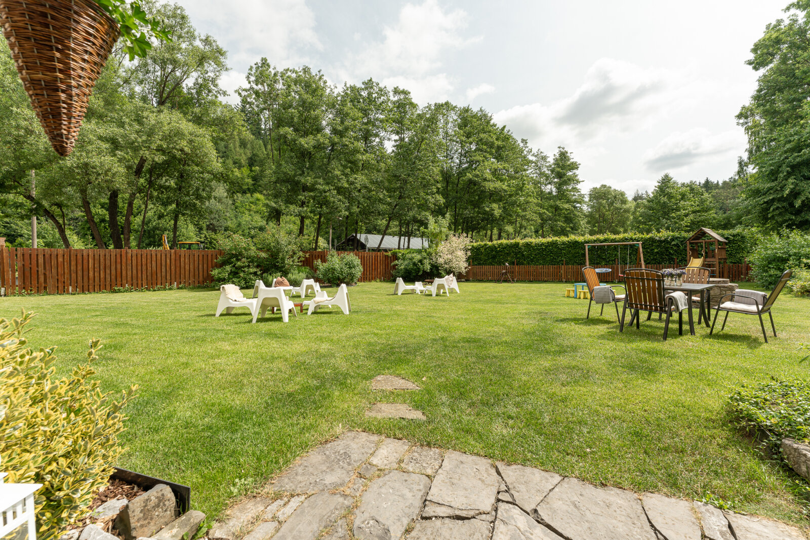 V teplých měsících pak příjde vhod velká oplocená zahrada (800m2) s otevřeným ohništěm, pískovištěm a houpačkami i krytá terasa s posezením.