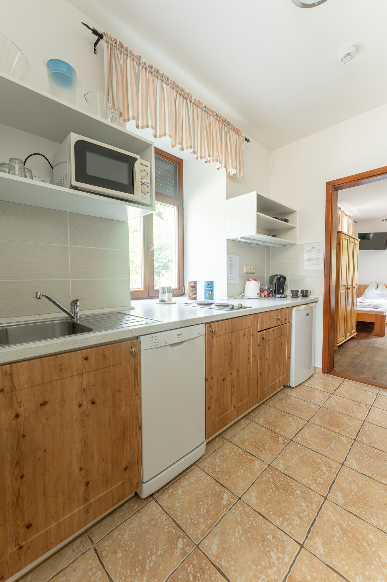Součástí je taktéž plně vybavená kuchyňku s varnou deskou, ledničkou, mikrovlnou troubou, myčkou, kávovarem na kapsle a rychlovarnou konvicí. Základní nádobí pro vaření je též samozřejmostí.