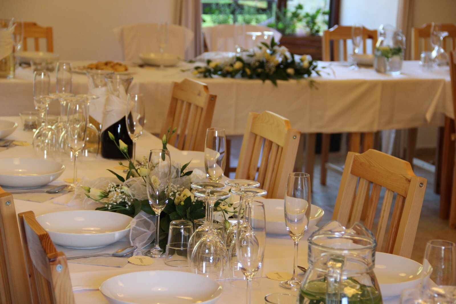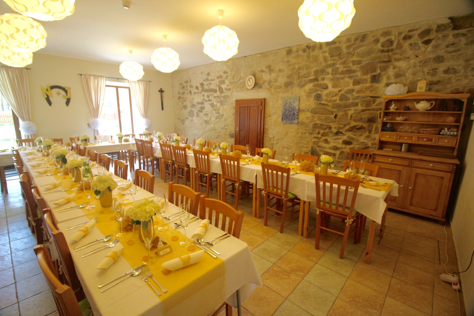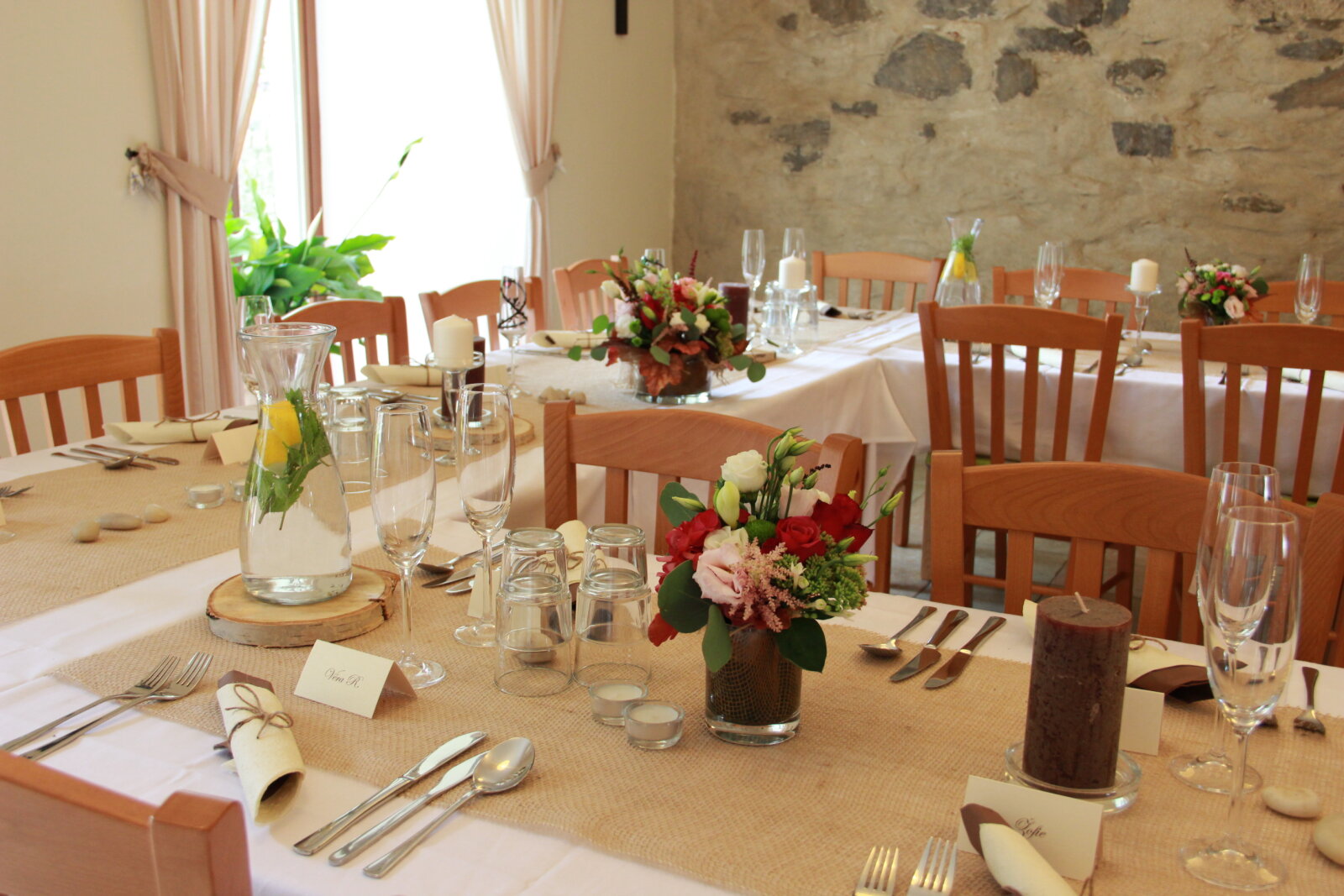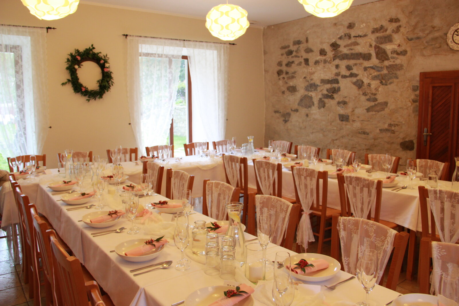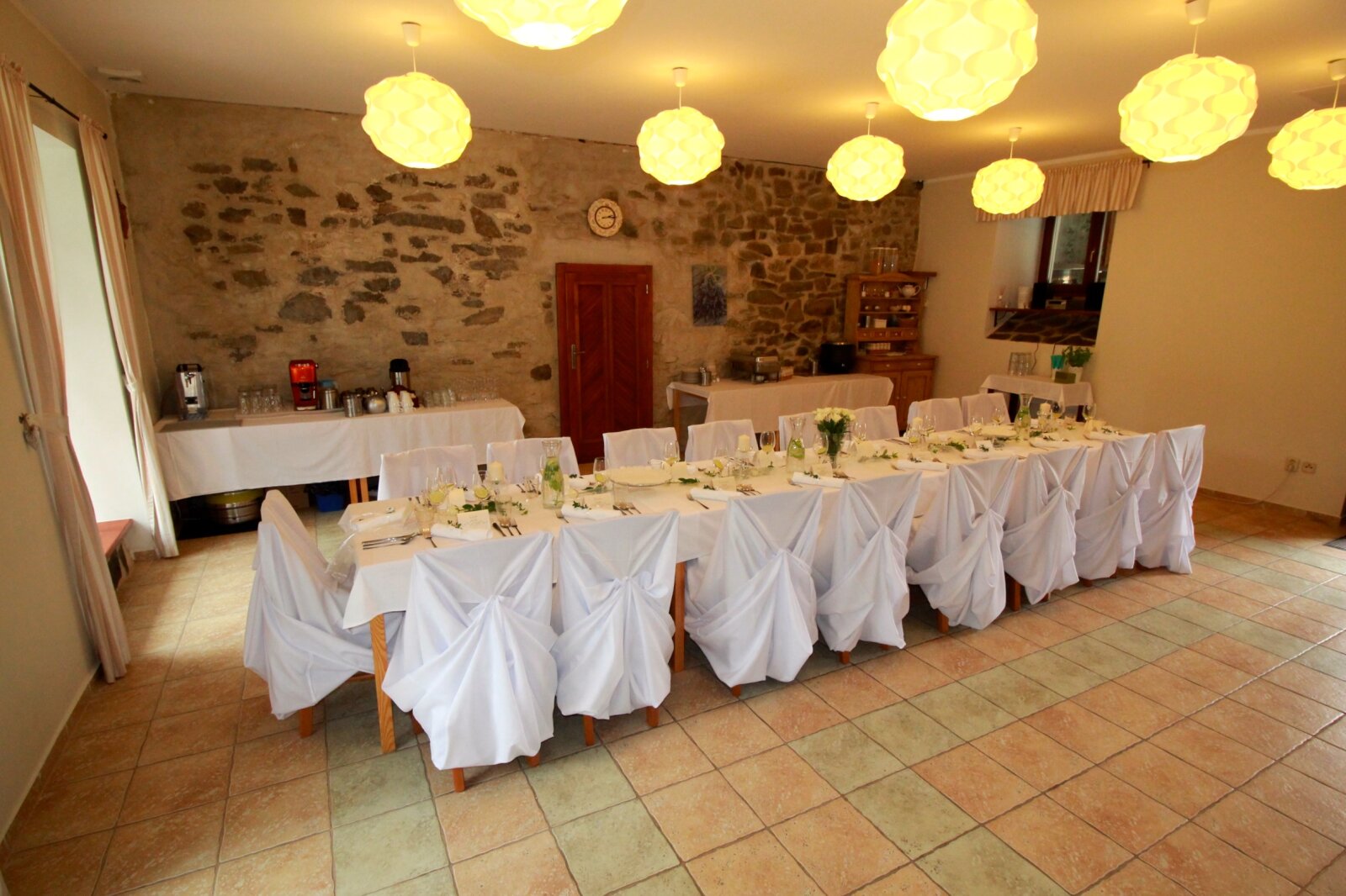 Útulný sál s kapacitou 42 resp. 54 hostů je ideální pro svatební oběd. Kombinací vnitřních a vnějších prostor jsem ovšem připraveni na svatby až do 75 hostů (formou garden párty). Umíme si poradit i s nepřízní počasí, náš svatební inventář nabízí párty stany, ohřívací lampy, i zahradní deky.
