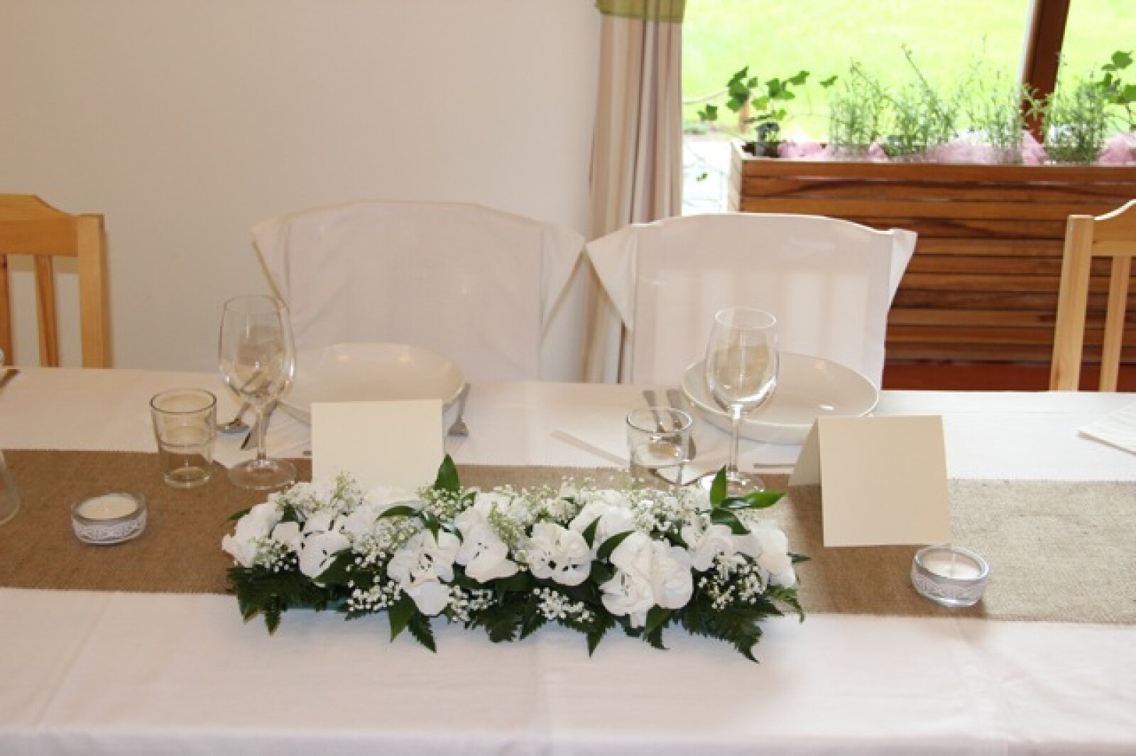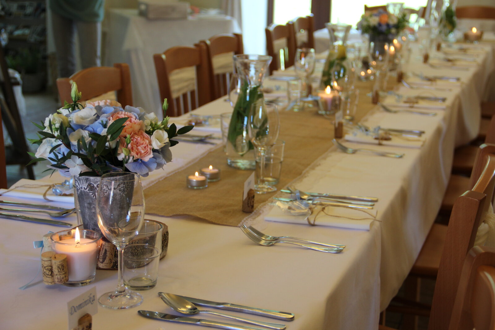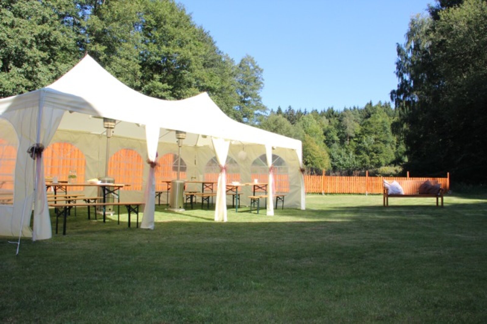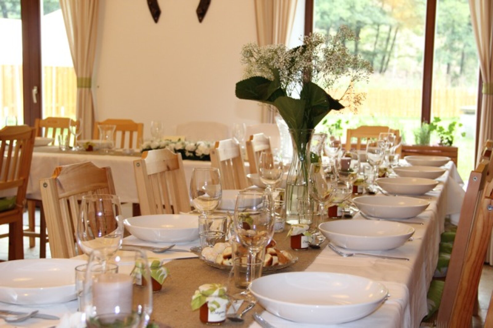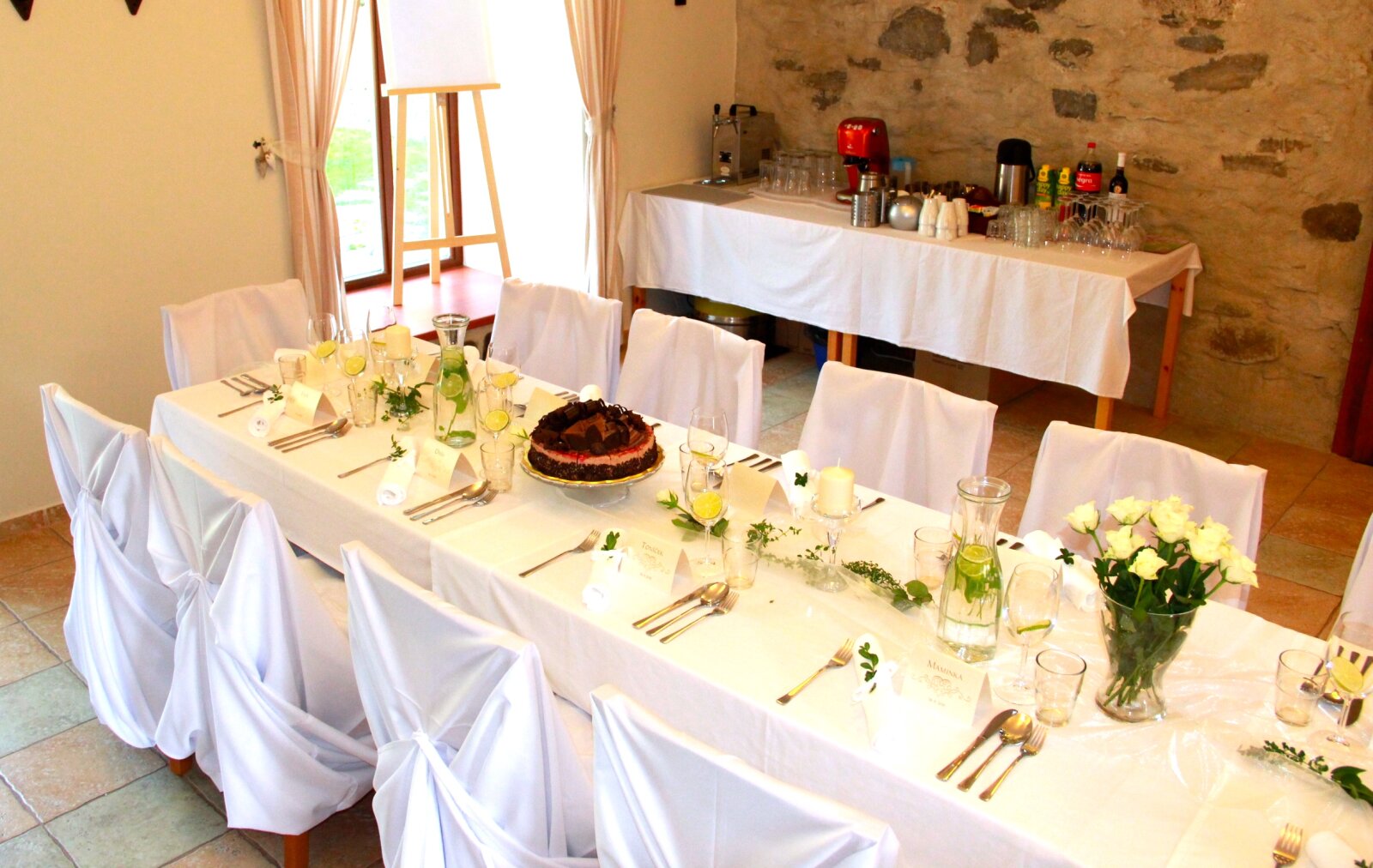 Útulný sál s kapacitou 42 resp. 54 hostů je ideální pro svatební oběd. Kombinací vnitřních a vnějších prostor jsem ovšem připraveni na svatby až do 75 hostů (formou garden párty). Umíme si poradit i s nepřízní počasí, náš svatební inventář nabízí párty stany, ohřívací lampy, i zahradní deky.