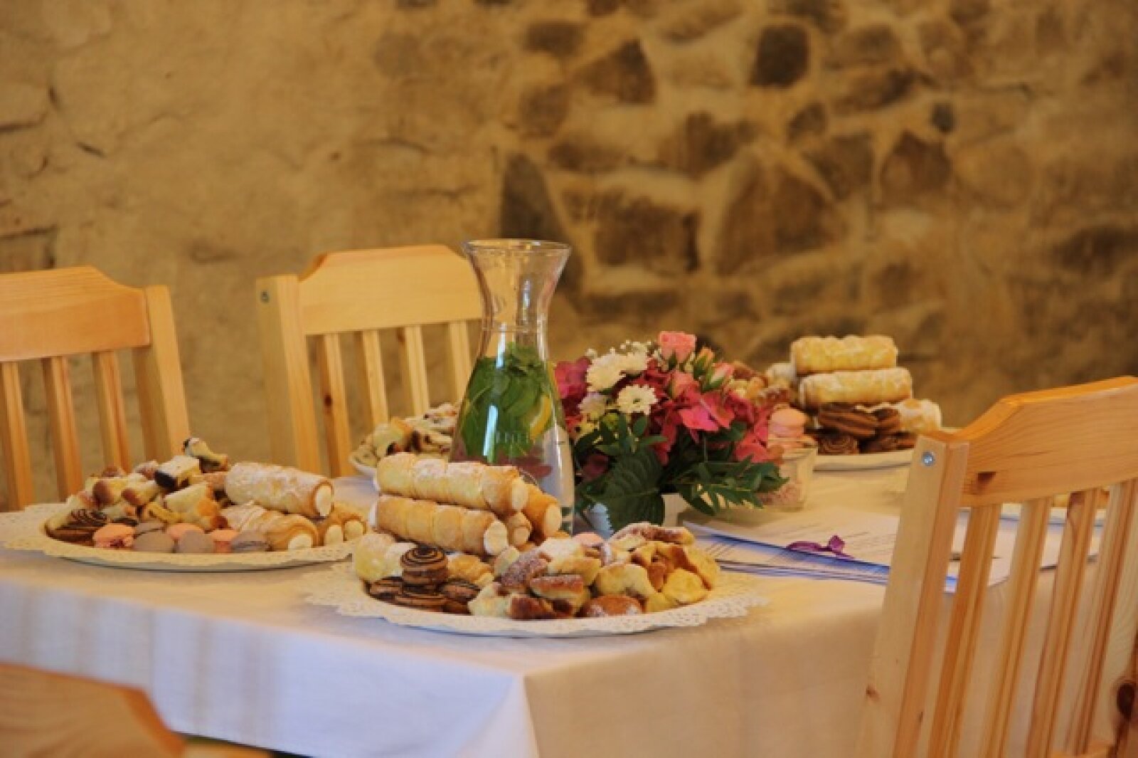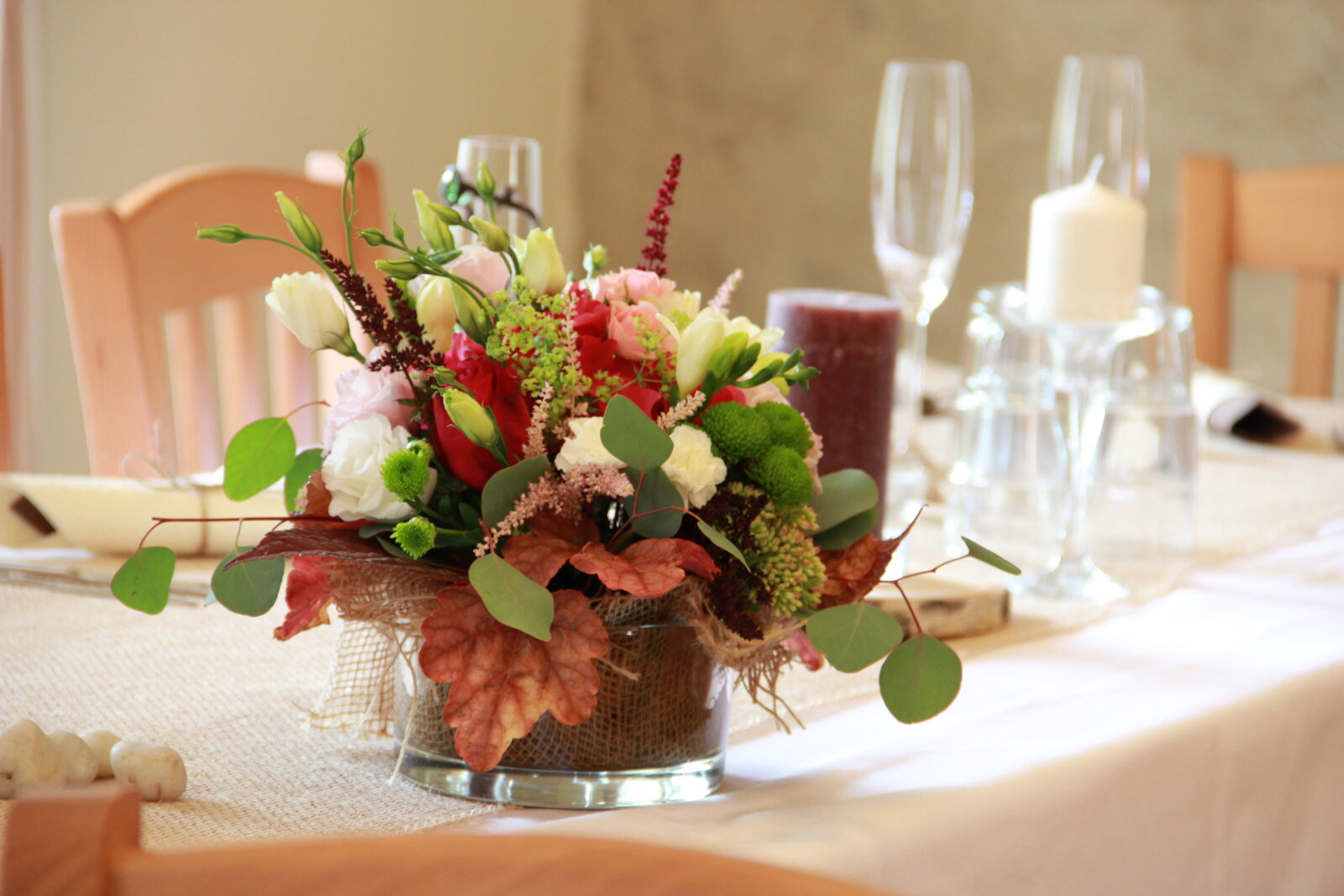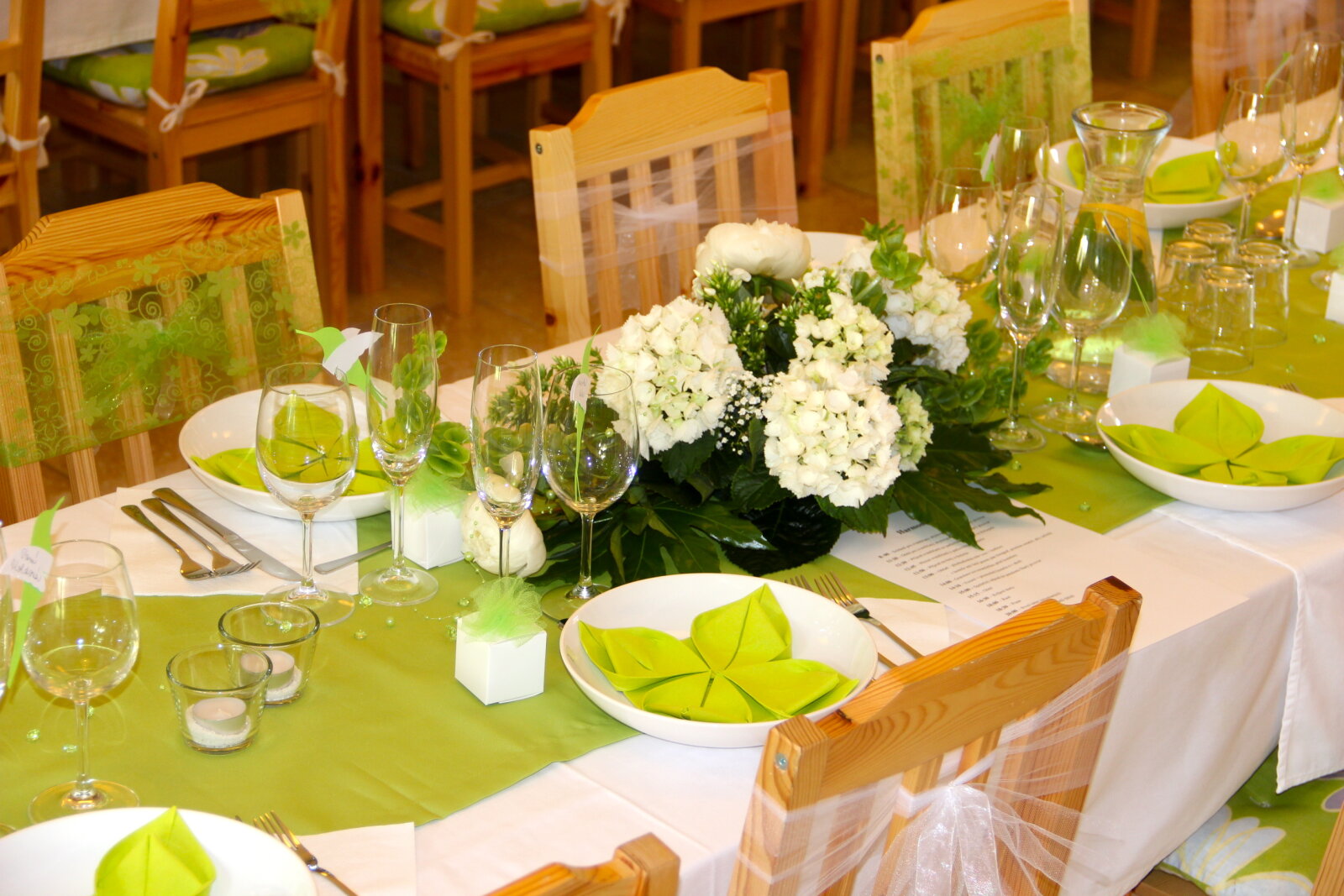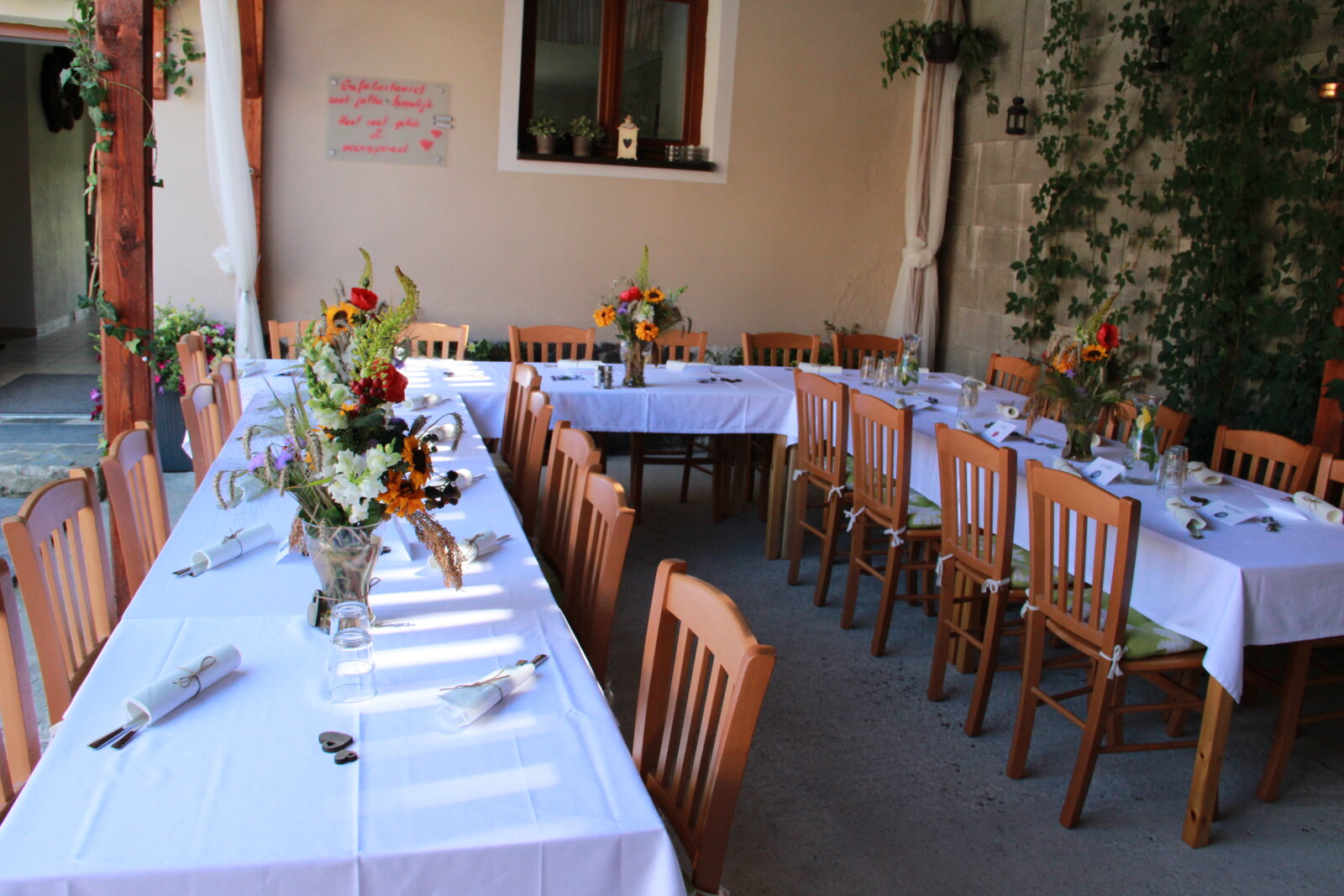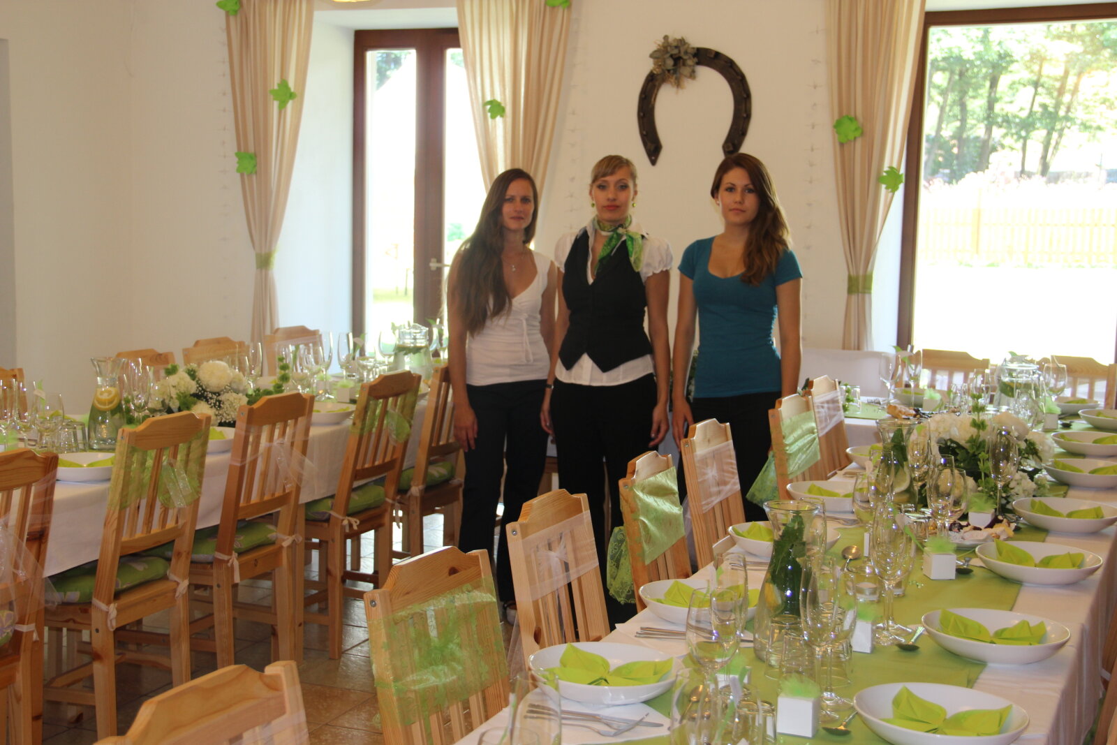 Útulný sál s kapacitou 42 resp. 54 hostů je ideální pro svatební oběd. Kombinací vnitřních a vnějších prostor jsem ovšem připraveni na svatby až do 75 hostů (formou garden párty). Umíme si poradit i s nepřízní počasí, náš svatební inventář nabízí párty stany, ohřívací lampy, i zahradní deky.